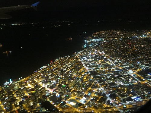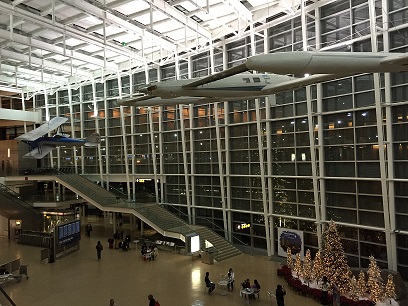 Left home at 3:40pm, drove on a tollway to the airport and arrived at offsite parking at 4:25pm. The road was not packed but still a little jammed for the holiday. The shuttle van picked me up but then waited for a while to look for another, I guess I was the only one at this moment. He took me to the Terminal C. On its way, the driver told me about his experiences in Seattle, trying to tell me a good restaurant and his upcoming holiday plan. Checked in with automated machine and passed the securty with my carrying bag. Walked to the gate at 4:45pm after grabbing a dinner for tonight from Einstein Bagles.