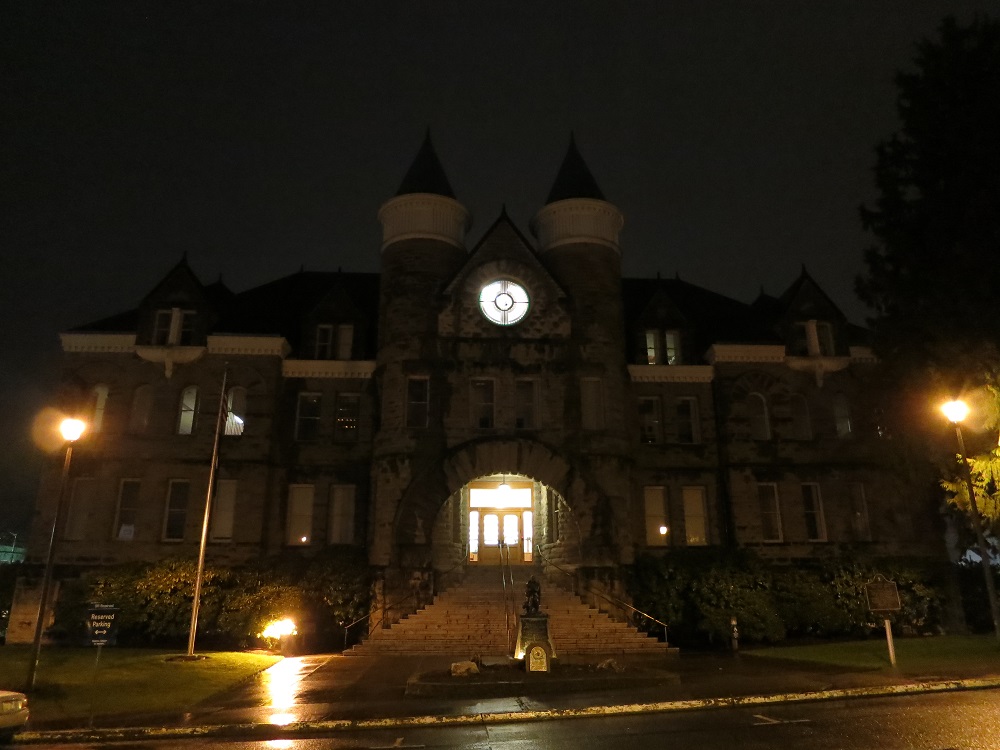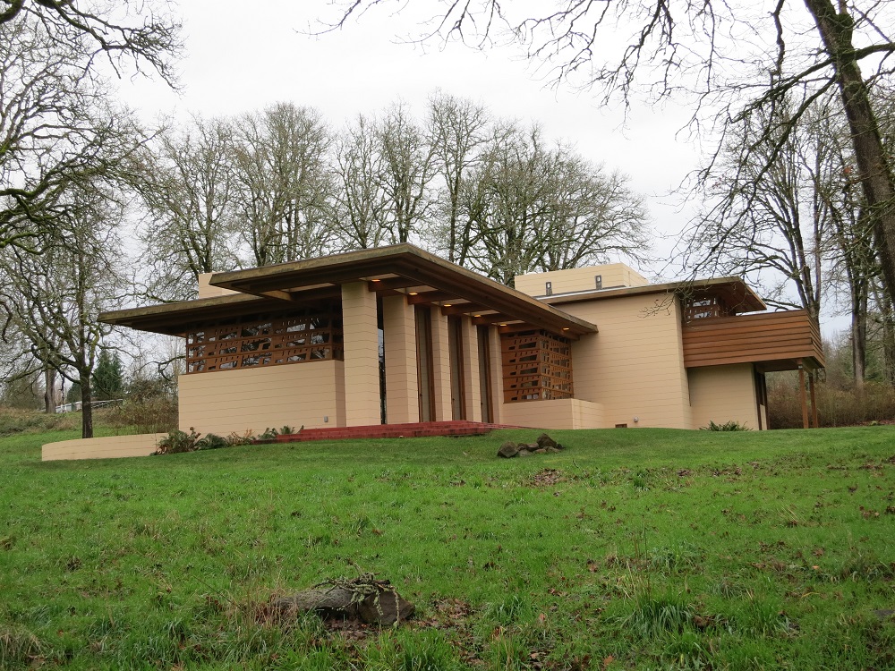 The museum was so interesting and I could not leave in 1 hour but finally left at museum at 11:50am, drove on country road toward Salem, OR. For every quarter mile, I see signs of winery, cheese, and other items. Took OR-153, 154 then 221 toward downtown Salem. The road was mostly straight but foggy condition made me difficult to drive. Drove past a shopping mall before the Christmas, then made a quick stop by the state capital at noon. I used a street parking which I only could afford 10 minutes worth of coins. I ran back to my car and felt hungry but moved on. Took 213 to northeast, I can see the green field and mountains in far which looked so beautiful even under cloudy sky. Arrived at Gordon house at 1:10pm as they were closed today. I just walked around the house and took pictures. Left short time later and took a local road until reaching at Oregon City. The road was winding and sometimes need to go slow when crossing a town but surely I made it.