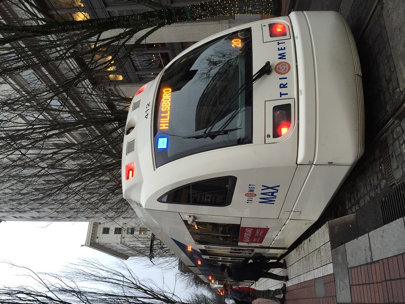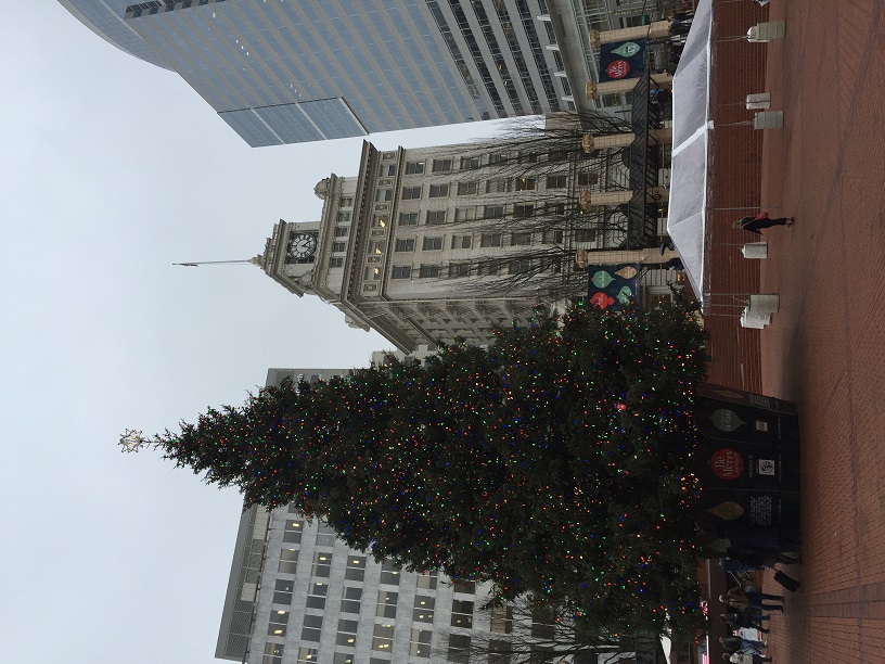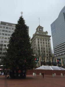 Kept driving toward Portland downtown to make a stop at Visitor's center to buy postcards. Driving through the center part of the city and found a place to park, bought parking ticket for 15 minutes. I ran to a nearby mall to buy postcards. The city was busy with people coming for the christmas shopping, the plaza at the center of the city was in cheerful mood. The city also has good publc transportation system, I see many light rail lines running and busses.