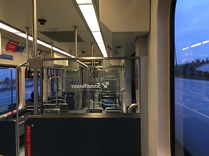 Getting on the light rail at 6:00pm at University place. I travelled back to the airport station in dark, looking out the dark outside.