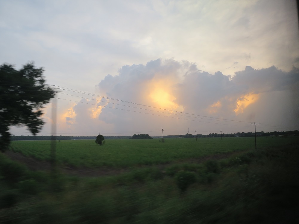 Orleans. The rain pouring down as the train moving by I-10. Entered a circle
