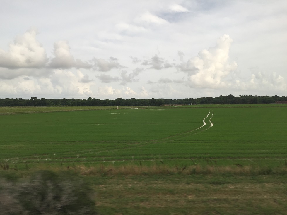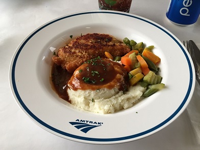The train left Houston station at 1:40pm under a hard rain, slowly moving and passing by the downtown. It initially moved forward then backward a bit to change the track before moving forward again. The train changed direction from eastward to north bound, then turning east again after passing I-610. Now the train is running outside the urban area and I see lots of green. I walked to a dining car and picked up a late lunch; fried chicken while sharing a table with a couple going to NOLA, and an Amtrak employee. The couple decided to take their Friday off since they find a good deal on a hotel, and I learned that this train can only go up to 79mph on the track because of the other freightt trains, from the Amtrak guy. We just had an serious train wreck a few days ago at northeast so this is a type of topic naturally comes up. He was heading to northeast to help a team there. He also told us that when Acelas trains cross each other at 180? mph and they can cause 15 deg tilt! After the lunch, I walked back to my seat.