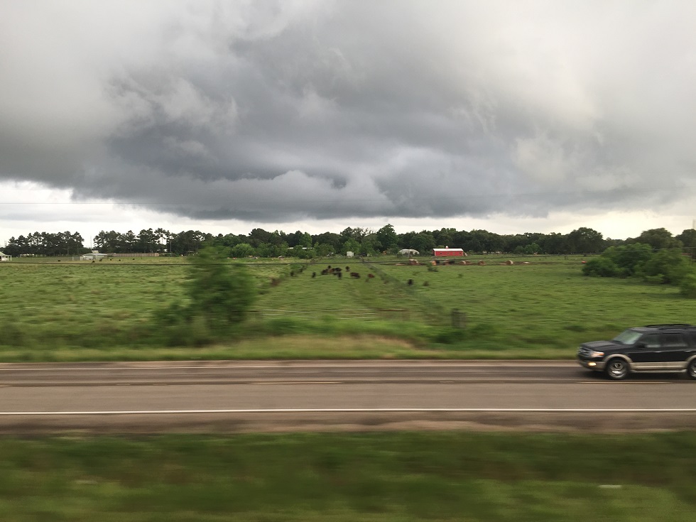 The bus departed at 9:00am, moving north little bit. to get on I-610 in ten minutes. The bus movd along the Lake Pontchartrain and kept going. It arrived at Baton Rouge at 10:20am to pick up a few more passengers. We left at 10:35am, crossing the river. There was a construction congestion and stuck for a while around 10:50am for 20 minutes. Passing Lafayette at 11:50am, then the bus made a stop at Egan, LA at 12:15pm so people can get food and take restroom break.