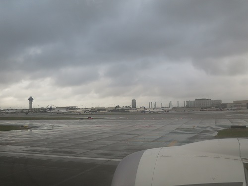 While I was facing bright sunshine, the plane slowly proceeded to the runway for departure. The plane had to wait for a few planes in line to depart and soon our turn is here, the plane departed at 7:50am to the south as usual, crossing the beltway as gaining the altitude. The plane made a right turn, giving me the last view of the airport and changed the heading toward California. Under morning sky, the plane kept going to west. The flight was very calm, I saw Phoenix, AZ on the way, as the plane approach towards the desitination, there is an area just off the Los Angeles where clouds covering the mountains. The plane was making a long shot for the straight in from the east side. The airport looks like under rainy condition so the plane entered low clouds and then broke into the view where rain streaming the window. The plane landed but had to wait off the runway until 9:05am local time. Stop and go after then finally moving at 9:15am to the date. Getting off from the plane around 9:25am.