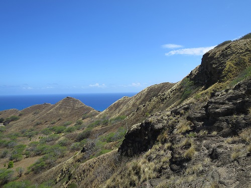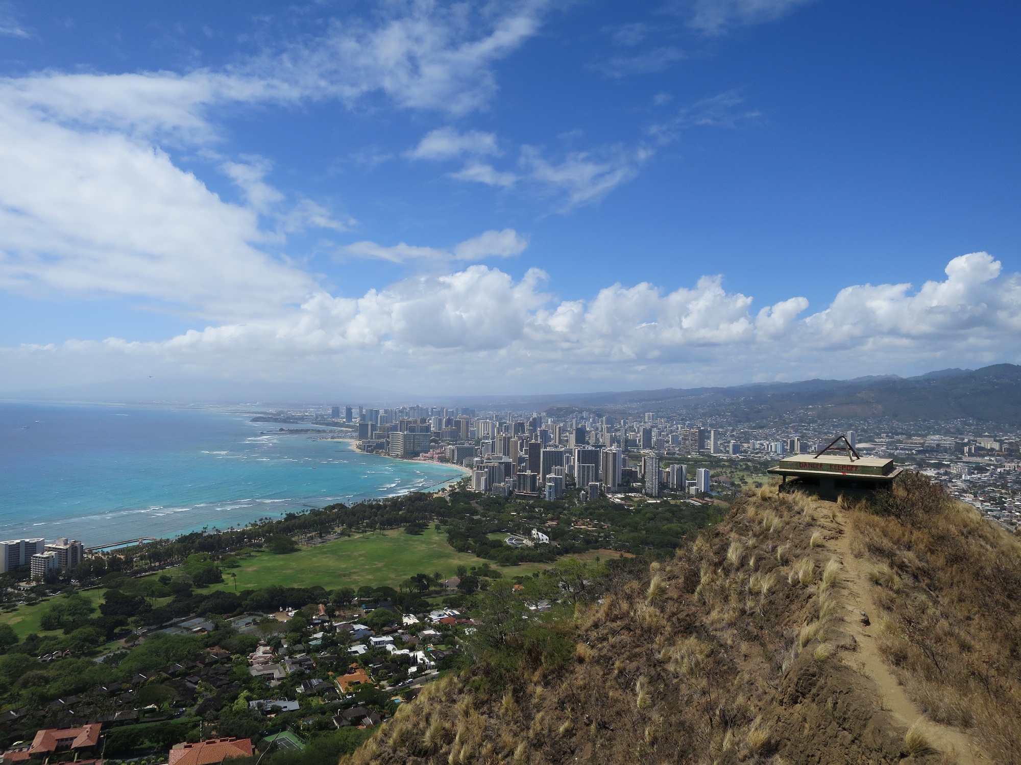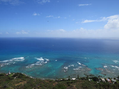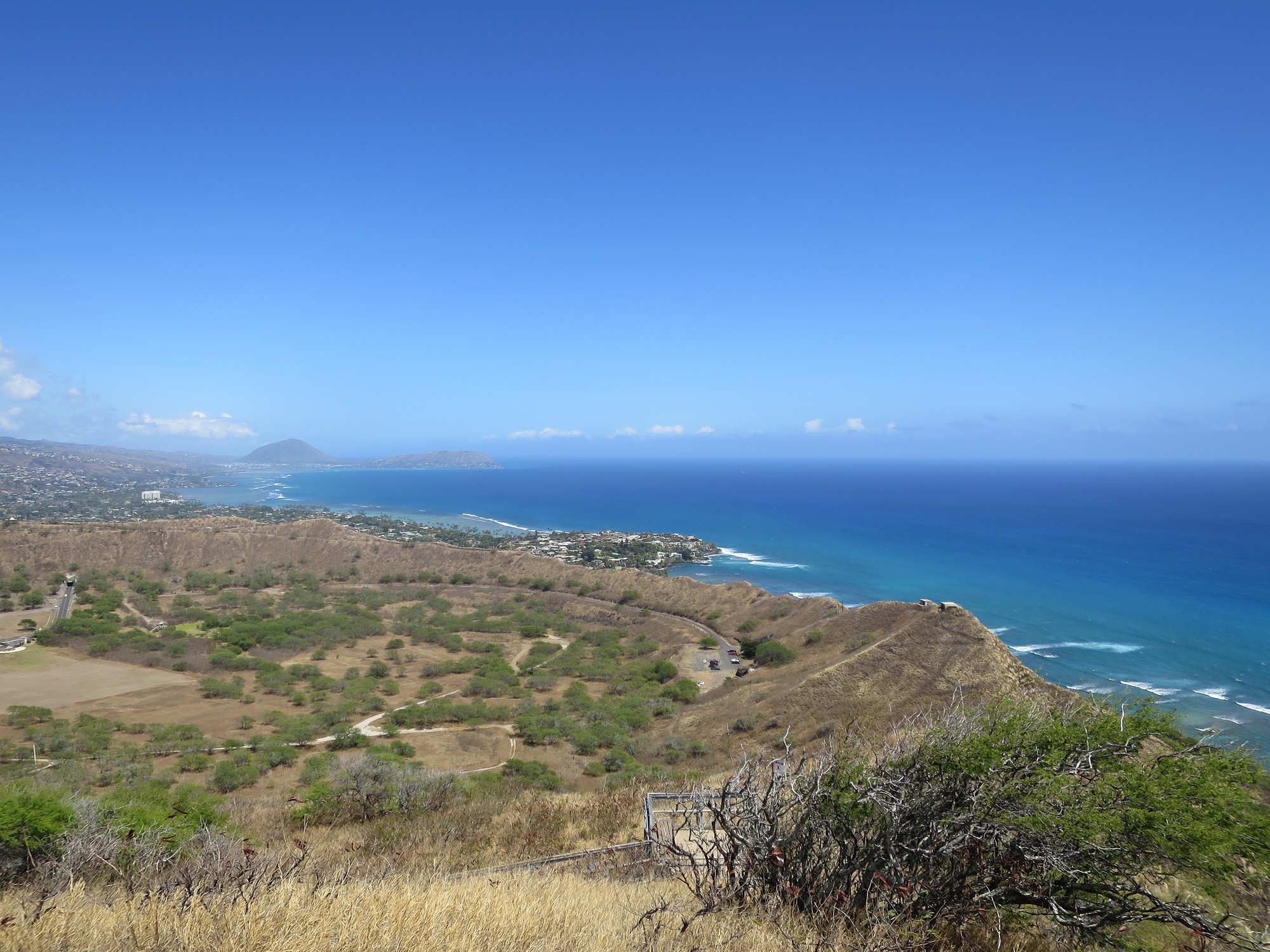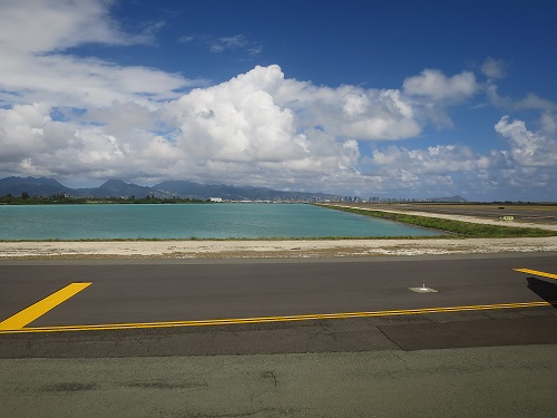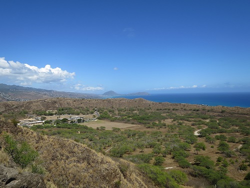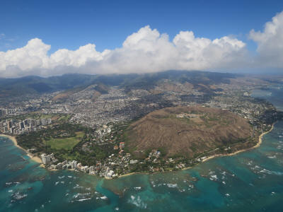 As the plane approaching to the Hawaii Island, my first view was ? which is southeast part of the island. The plane flew along the coastal line and turning around the Diamon Head, then while looking at Waikiki beach to the right, the plane made the final approach to the airport.