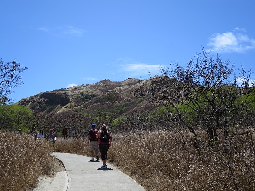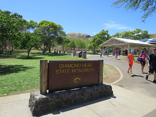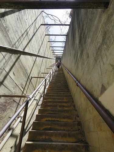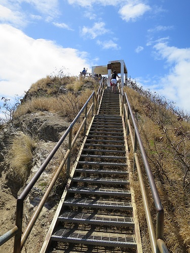 Decided to go to Diamond Head for the rest of the afternoon. I entered the location on the GPS and began driving off the Pearl Harbor area. Drove on freeway then getting off to a local road. I have seen people parking on street and walking on sidewalk along the road so I began to worry that I may have to park outside and dp extra walk. After passing a tunnel, I arrived at the parking. I thought I may have to wait for a while but actually there were plenty of parking available by this time. Parked my car at 1:30pm, began walking upona trail, thru a tunnel, going up spiral stairs and made it to the peak around 2:00pm. It was not too bad. The scenary was nice and