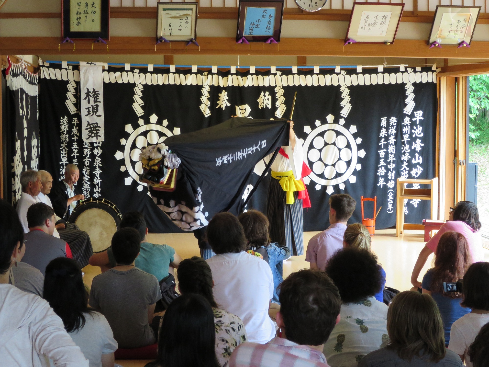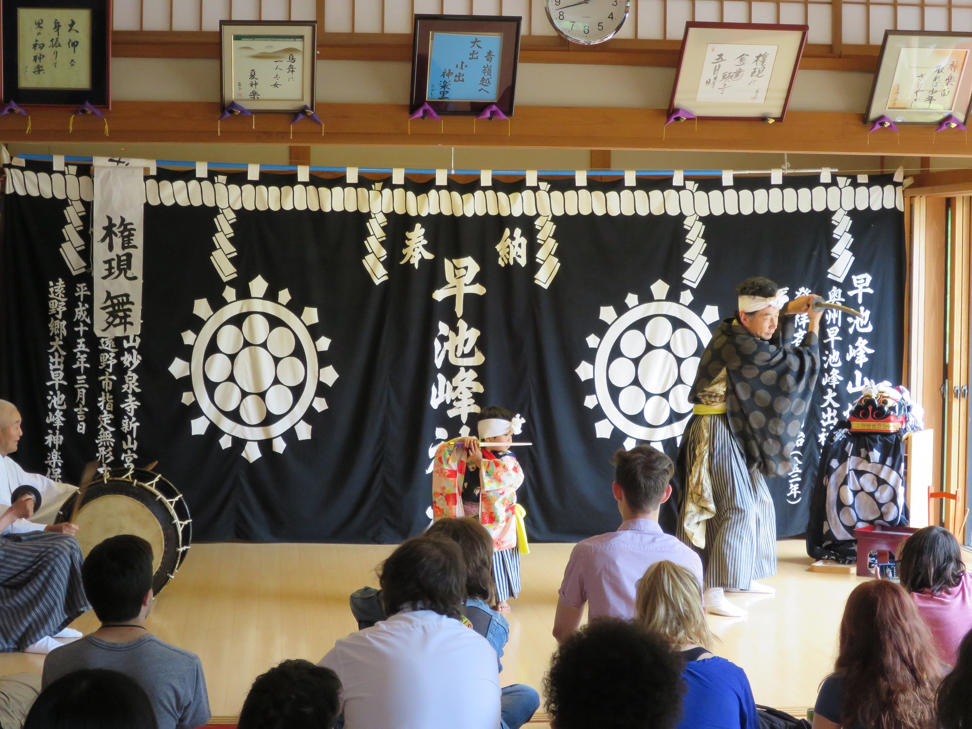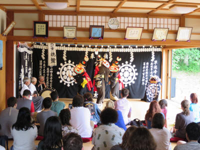 Drove a short distance to the shrine. The rain began to come down as we walk down the path at the shrine, but it was okay. After the shrine visit, we moved to a building nearby where we get to see Kagura, a traditional dance.