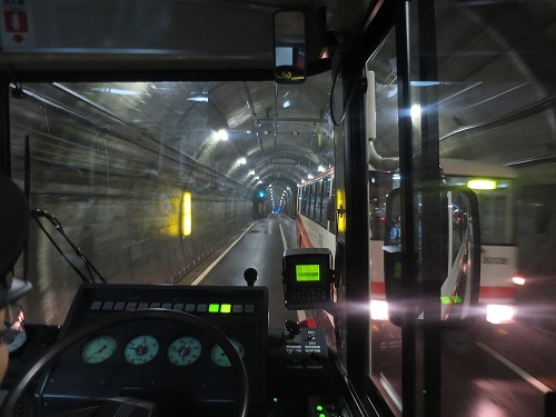 After arriving at Murodo, immediately switching to a electric bus. It was running entirely in tunnel and uses electricity supplied to drive. It is totally understand the place where has practically no ventilation should use pollusion free transportation. The air inside the tunnel was nicely chilly.