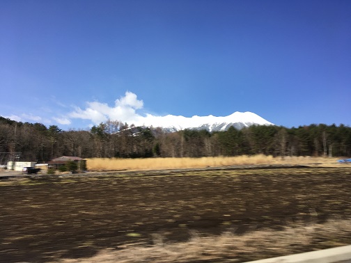 I stepped outside and looked outside. It was under clear sky with bright sunshine. I can see the peak of Mt. Ontake clearly for the first time.