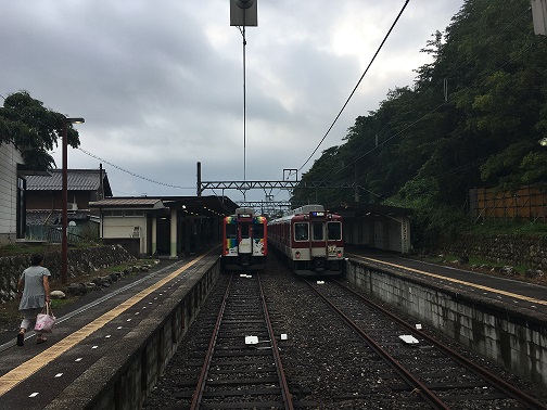 The train left the station with many people. As the train head to Yokkaichi, I was typing up an email to my dad and brother. I was remembering of the summer time in Mt. Gozaisho has a lot of memories from my elementary school years. One year my dad took me and I stumbled at the very beginning and cried, later in that hike, I was so tired and I was following my dad while crying to the summit. Now I can reach the summit without falling or crying. Another year I complained to my mom that I did not get a chance to go anywhere over the summer and she went to hike with me. She is long gone but I really appreciate what she has done for me. The train kept moving under summer sunny sky, I can see people get on and off at each station, I guess riding on this once every half hour train from country side to place with more retail stores must be fun. The train is finally at the Yokkaichi, where train moved slow and making a sharp right turn to the station.