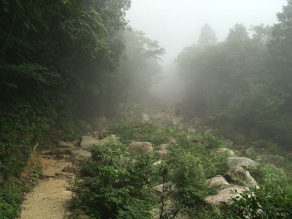 After getting off the car, I checked the gear for the last time. I looked around surrounded by mountain with fog. I slowly walked up the hilly narrow road toward the starting point of the back trail.