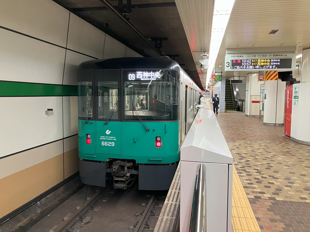 After exiting from JR train station, I took a couple of long escalators down to the underground level to use a city subway to Sannomiya. When I took a seat, I had a few minutes before 10:42am departure. The train looked new, and this kind began introduced in 2019 so no reason I do not know about. The train moved smoothly and arrived at the destination.