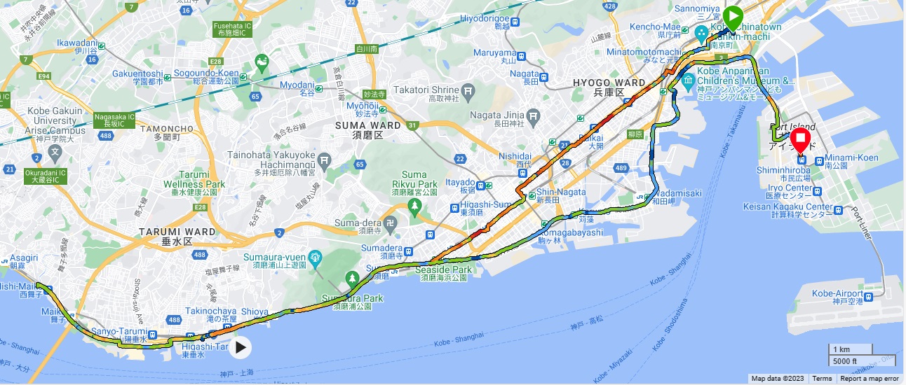 After reaching the turnaround just off Nishi-Maiko station, I now heading toward east. I was getting hot so I took off my windbreaker. I did not want to throw it away because I know there is a chance that wind could pick up. The road is now reconfigured so two lanes are available to my side, just like I was coming this way. At the merging point with Route 2, I kept going straight and reaching Wada Misaki from here, changed the direction toward north, entering Kobe Harborland, now going up the ramp no Route 2 bypass which is told 10m raise over 150m. There are a lot of people already gave up and walking but I managed to run up. Now turning toward Port Island, getting off the ramp and making a few more turns before the final straight. There was Yuko Arimori who is a former marathon Olympian welcoming runners back at the last.