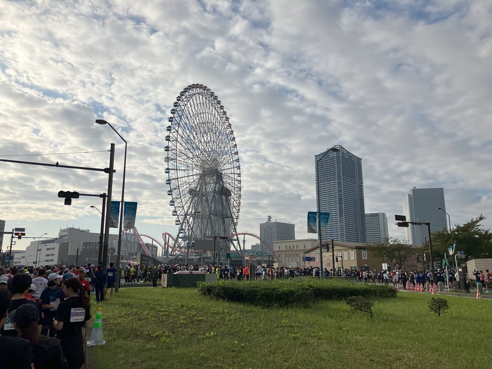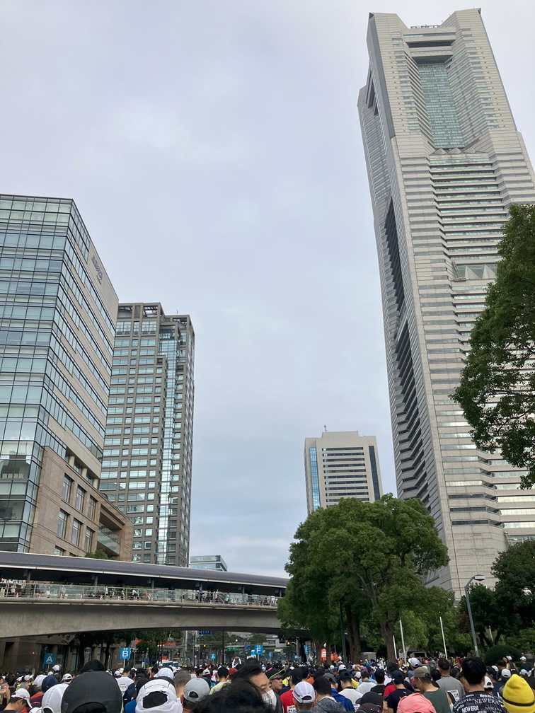 Proceeding underground hallway to the east side of Yokohama station, began to see runners walking the same direction to Pacifico Yokohama arena. After getting there around 7:40am, I ate extra meals, get changed, dropped off my bag, then headed out to the starting point The announcement was made that I have to get in the line, used restroom for the one last time, then headed out. It was about 10 minutes walk, get to see the Ferris wheel with the clock, and Nippon Maru, a training ship retired here.
