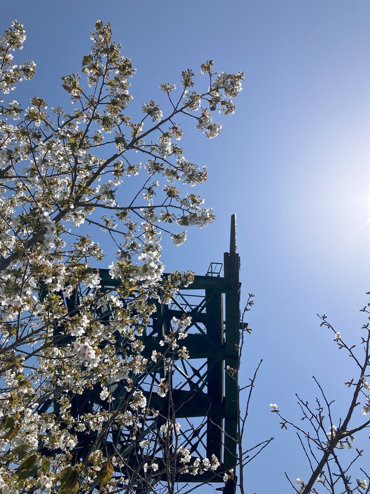 Cherry blossom still blooming here, former ropeway pillar on the back.