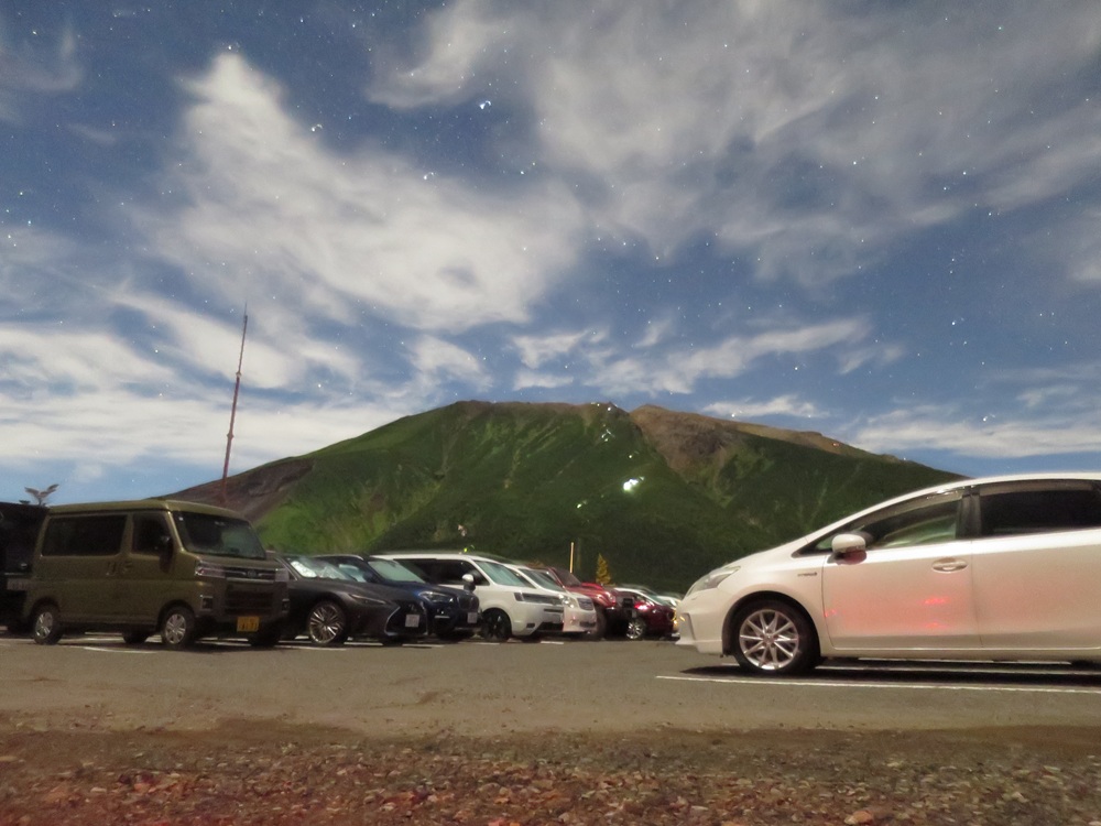 Before reaching Makino Dam, GPS shows a way to take a left route which goes south side of Ontake Lake, then reached the Otaki Village. From here I am back on Route 256 and continuous steep winding uphill. I am already tired and sleepy, and so many turns just drove me crazy but survived. I can see the beautiful night sky as I was going up to Tanohara Parking. I arrived there around 3:30am, stopped by at visitor center to use restroom, and went back to my car. I can see the faint light on the surface of the Mt. Ontake, assuming there are people going up so they can see the sunrise. It was just chilly so I pulled out a blanket I brought and took a short sleep until 5:00am on the backside of the car.
