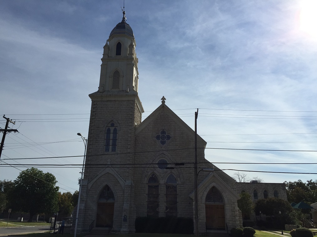 First United Methodist Church of Weatherford: 1867年に建てられた会合所は、1886年の竜巻によって被害を受けた為に3年後から現在の場所にヴィクトリアと
